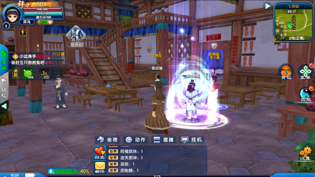 **三、技术力加持的武侠美学**游戏采用自研的"玲珑"引擎,在手机端实现了端游级的画面表现。角色施展轻功时,衣料模拟系统会实时计算风速对衣摆的影响,而"踏雪无痕"技能留下的足迹,则根据物理碰撞原理呈现深浅变化。更令人惊艳的是实时天气系统,当游戏内时间推进到戌时,七侠镇会飘起带着橘色光晕的晚霞,此时若玩家站在屋顶使用"望气术",有机率看到远处山脉轮廓逐渐拼凑成轩辕录的残页图案。社交玩法深度结合武侠文化,独创的"传功茶会"允许玩家在客栈大堂摆宴,通过完成"接住郭芙蓉失手打翻的茶杯""配合白展堂变戏法"等小游戏获取经验。而每周三开启的"武林大会"更是打破传统PVP模式,获胜者不仅能获得称号,还能触发全服公告"邢捕头敲锣宣告:恭祝少侠荣获'关中大侠'称号,赏铜钱五百文",这种充满市井气的荣誉系统,恰是对原作解构武侠精神的最佳致敬。