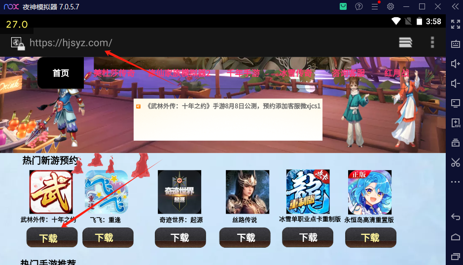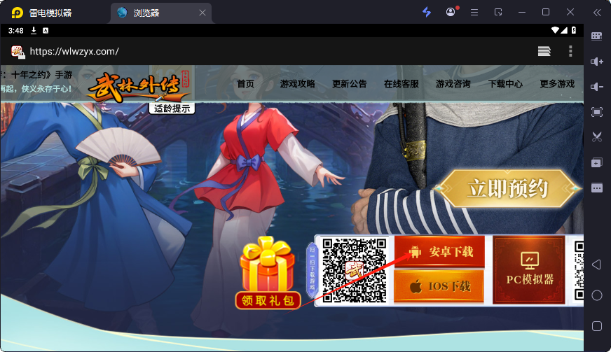 第二步,下载《武林外传:十年之约》。这里有两种方法可供选择。方法一:打开安装好的雷电模拟器,找到其内置的浏览器,在地址栏输入游戏官网(wlwzyx.com)或怀旧星光手游官网(hjsyz.com),然后点击安卓下载,游戏就会自动在模拟器内下载并安装。
